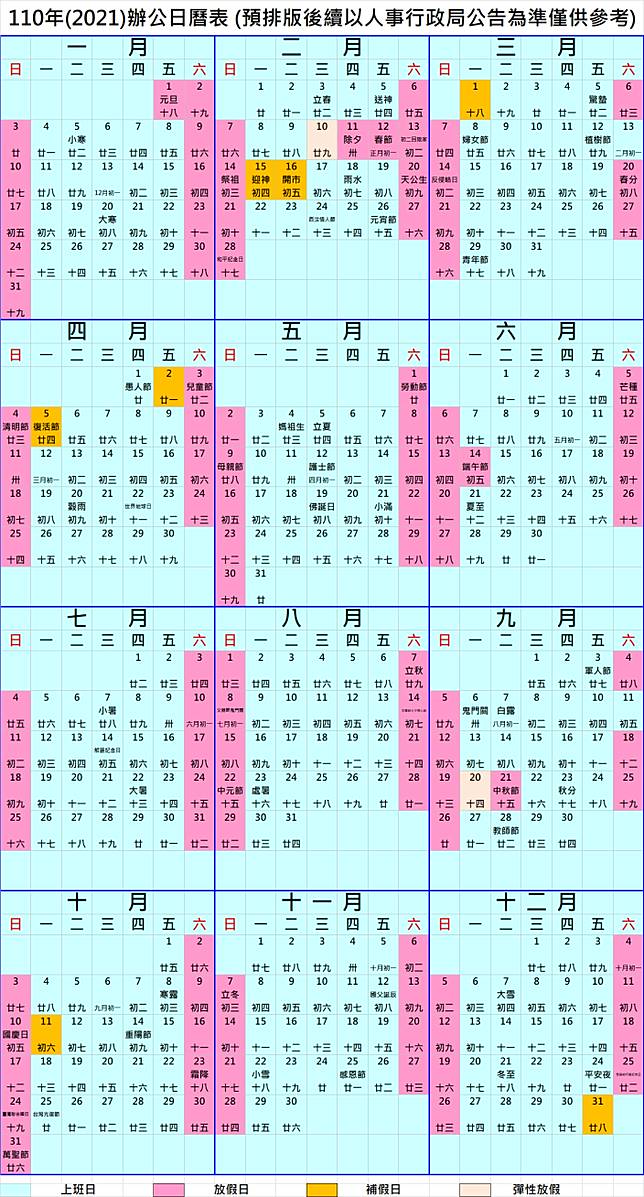 2020/12/23 更新:民國 110 年(2021年)的公家機關行事曆出來了,想在連續假期安排旅行、出遊的人 雖然這是公務人員的辦公、放假用的行事曆,不過由於大部分非服務業、運輸業的公司也都會參考這個政府機關的行事曆來放假或….加班(因為郵局銀行沒.